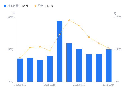 近一年(2024年9月30日至2025年9月30日),宇新股份A股股东户数从1.24万户,增加至1.55万户,增幅24.98%,区间股价下跌1.34%。