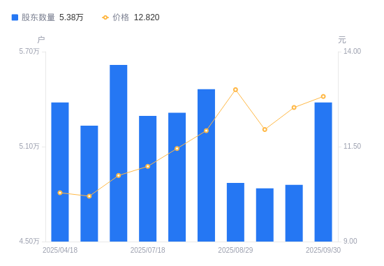 近一年(2024年9月30日至2025年9月30日),麦捷科技A股股东户数从4.69万户,增加至5.38万户,增幅14.62%,区间股价上涨37.33%。