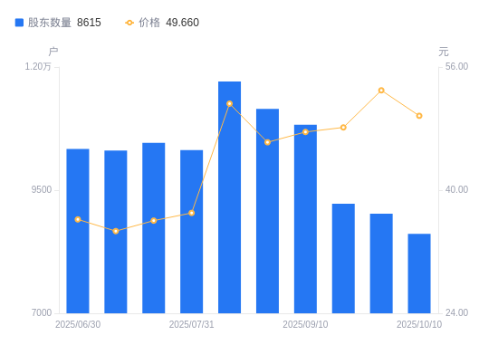 近一年(2024年10月18日至2025年10月10日),信邦智能A股股东户数从1.13万户,减低至8615户,降幅23.68%,区间股价上涨126.97%。