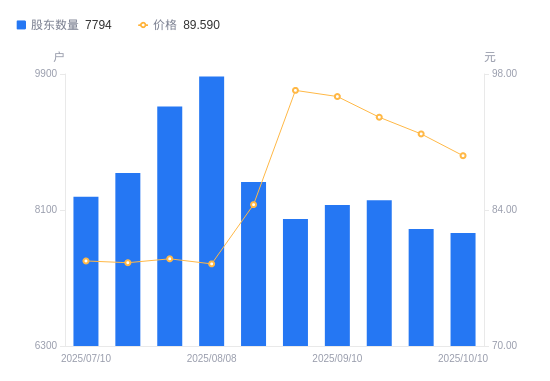 近一年(2024年9月30日至2025年9月30日),博实结A股股东户数从1.64万户,减低至7850户,降幅52.27%,区间股价上涨61.09%。