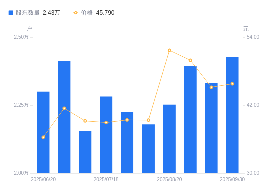近一年(2024年9月30日至2025年9月30日),奥海科技A股股东户数从2.36万户,增加至2.43万户,增幅3.09%,区间股价上涨78.19%。