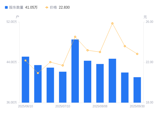 10月11日消息,数据显示,截至2025年9月30日,常山北明A股股东总户数为41.05万户,较上期(2025年9月19日)减少9242户,降幅2.20%。公司最新A股总股本为15.99亿股,其中流通A股15.88亿股,户均持有流通A股数量为3868.42股,较上期增加85.18股,增幅2.25%;户均持流通A股市值8.83万元,较上期减少968.46元,降幅1.08%。
