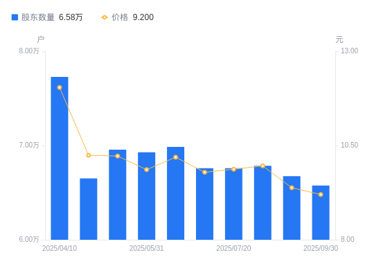 近一年(2024年9月30日至2025年9月30日),登海种业A股股东户数从6.58万户,减低至6.58万户,降幅0.00%,区间股价上涨4.41%。