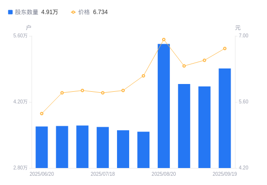 近一年(2024年9月20日至2025年9月10日),新朋股份A股股东户数从3.76万户,增加至4.53万户,增幅20.48%,区间股价上涨56.92%。