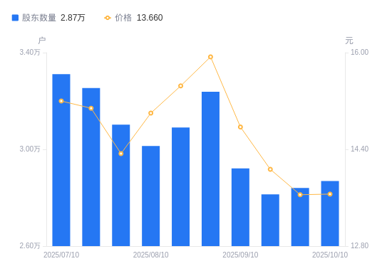 近一年(2024年12月10日至2025年10月10日),七彩化学A股股东户数从2.41万户,增加至2.87万户,增幅18.91%,区间股价上涨3.64%。
