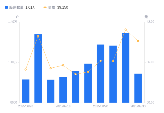 近一年(2024年9月30日至2025年9月30日),富特科技A股股东户数从1.74万户,减低至1.01万户,降幅41.79%,区间股价上涨55.92%。