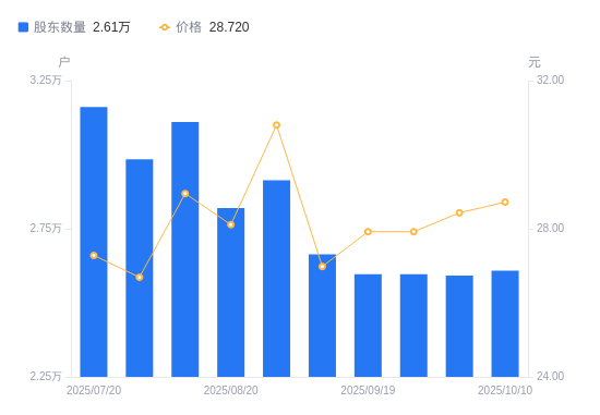 10月11日消息,数据显示,截至2025年10月10日,中新赛克A股股东总户数为2.61万户,较上期(2025年9月30日)增加158户,增幅0.61%。公司最新A股总股本为1.71亿股,其中流通A股1.62亿股,户均持有流通A股数量为6219.93股,较上期减少37.91股,降幅0.61%;户均持流通A股市值17.86万元,较上期增加725.99元,增幅0.41%。