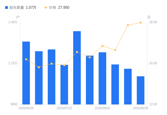 近一年(2024年9月30日至2025年9月30日),星华新材A股股东户数从1.11万户,减低至1.07万户,降幅3.59%,区间股价上涨150.31%。