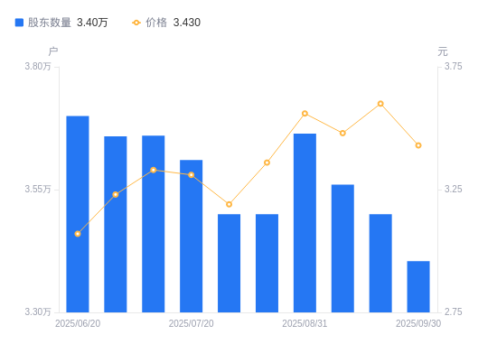 近一年(2024年9月30日至2025年9月30日),云维股份A股股东户数从3.15万户,增加至3.4万户,增幅8.25%,区间股价上涨32.95%。
