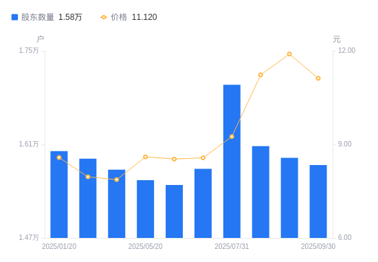 近一年(2024年9月30日至2025年9月30日),ST西发A股股东户数从1.78万户,减低至1.58万户,降幅11.20%,区间股价上涨65.23%。