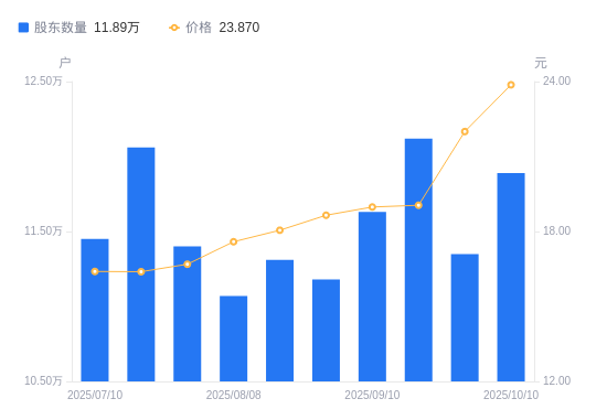近一年(2024年10月10日至2025年10月10日),西部矿业A股股东户数从10.5万户,增加至11.89万户,增幅13.24%,区间股价上涨44.84%。