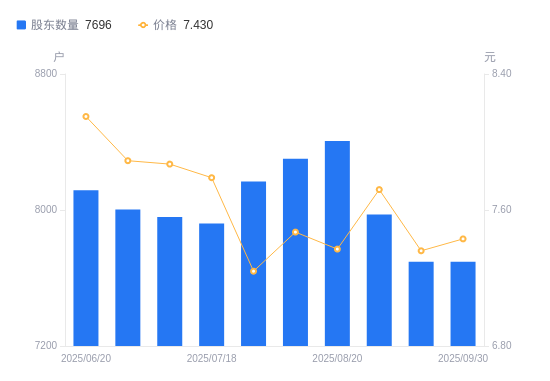 近一年(2024年9月30日至2025年9月30日),*ST交投A股股东户数从7292户,增加至7696户,增幅5.54%,区间股价上涨40.45%。