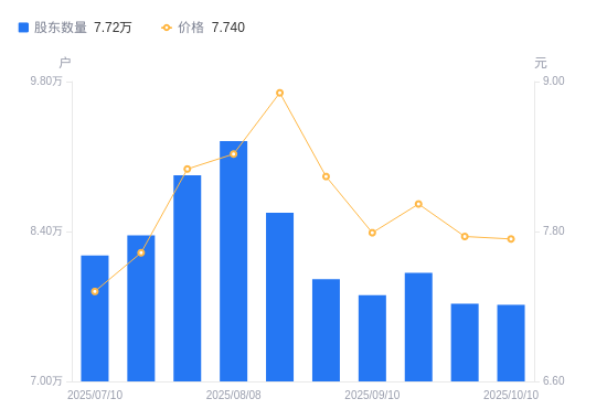 10月12日消息,数据显示,截至2025年9月30日,远东传动A股股东总户数为7.73万户,较上期(2025年9月19日)减少2882户,降幅3.60%。公司最新A股总股本为7.3亿股,其中流通A股6.02亿股,户均持有流通A股数量为7794.83股,较上期增加280.32股,增幅3.73%;户均持流通A股市值6.05万元,较上期增加221.5元,增幅0.37%。