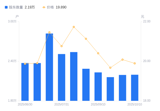 近一年(2024年10月10日至2025年10月10日),丝路视觉A股股东户数从2.42万户,减低至2.19万户,降幅9.39%,区间股价下跌0.05%。