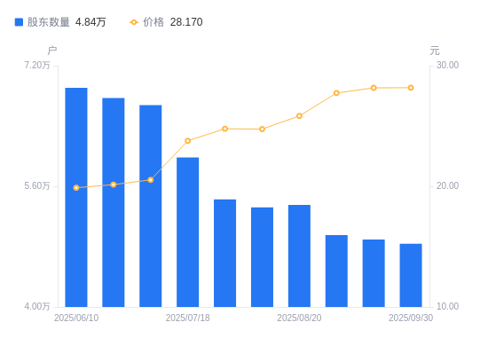 近一年(2024年9月30日至2025年9月30日),兴发集团A股股东户数从7.25万户,减低至4.84万户,降幅33.24%,区间股价上涨42.71%。