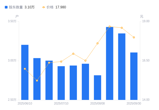 近一年(2024年9月30日至2025年9月10日),通达动力A股股东户数从3.23万户,增加至3.35万户,增幅3.49%,区间股价上涨50.65%。