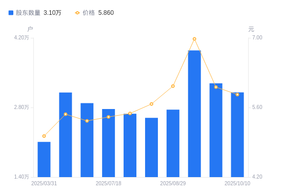 近一年(2024年12月31日至2025年10月10日),三峡旅游A股股东户数从1.98万户,增加至3.1万户,增幅56.54%,区间股价上涨17.32%。