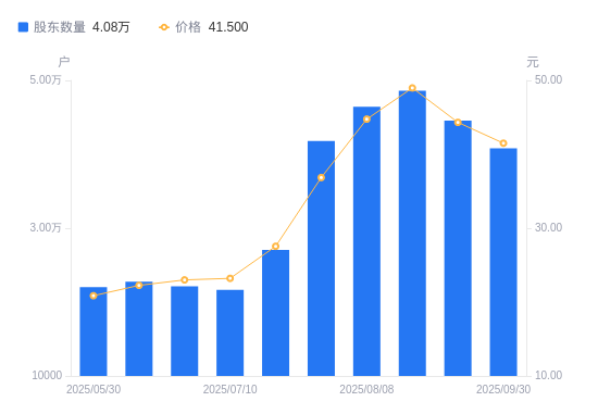 近一年(2024年9月30日至2025年9月30日),阿石创A股股东户数从2.17万户,增加至4.08万户,增幅88.32%,区间股价上涨118.42%。