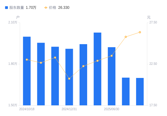 近一年(2024年10月18日至2025年10月10日),博盈特焊A股股东户数从2万户,减低至1.7万户,降幅14.98%,区间股价上涨17.16%。