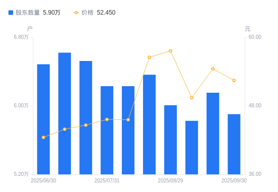 近一年(2024年9月30日至2025年9月30日),高新发展A股股东户数从8.35万户,减低至5.9万户,降幅29.31%,区间股价上涨16.75%。
