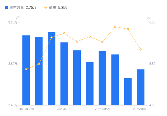 近一年(2024年10月10日至2025年10月10日),海翔药业A股股东户数从2.79万户,减低至2.75万户,降幅1.64%,区间股价下跌5.19%。