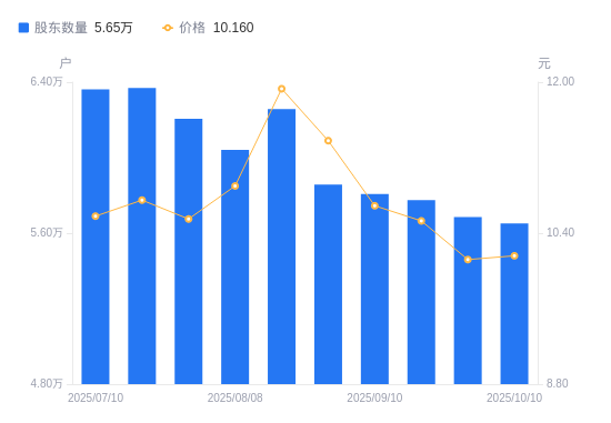 近一年(2024年10月10日至2025年10月10日),银邦股份A股股东户数从4.82万户,增加至5.65万户,增幅17.17%,区间股价下跌29.25%。