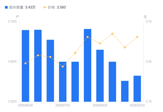 近一年(2024年11月30日至2025年10月10日),云维股份A股股东户数从3.3万户,增加至3.43万户,增幅3.94%,区间股价下跌4.04%。