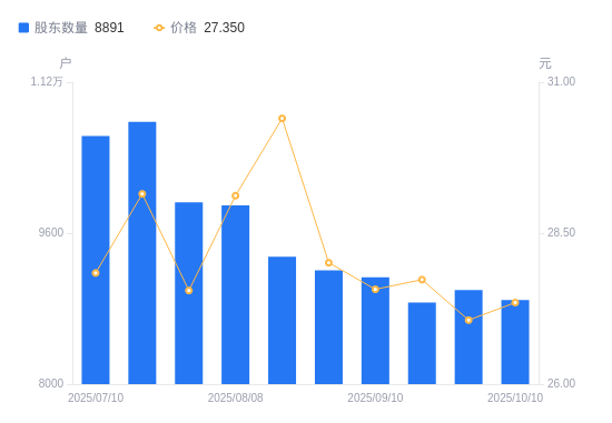 近一年(2024年10月18日至2025年10月10日),锡南科技A股股东户数从9628户,减低至8891户,降幅7.65%,区间股价上涨23.98%。