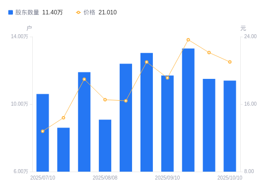 近一年(2024年10月10日至2025年10月10日),兴森科技A股股东户数从9.3万户,增加至11.4万户,增幅22.58%,区间股价上涨95.08%。