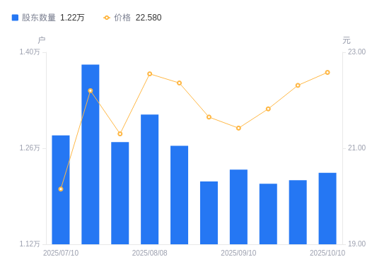 近一年(2024年10月10日至2025年10月10日),尤安设计A股股东户数从1.43万户,减低至1.22万户,降幅14.10%,区间股价上涨24.34%。