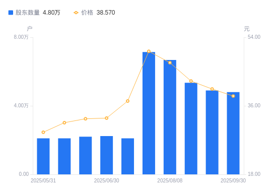 近一年(2024年9月30日至2025年9月30日),高争民爆A股股东户数从2.28万户,增加至4.8万户,增幅110.36%,区间股价上涨46.82%。
