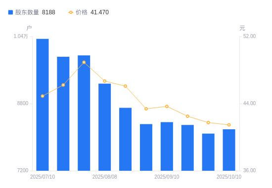 近一年(2024年10月18日至2025年10月10日),万邦医药A股股东户数从9434户,减低至8188户,降幅13.21%,区间股价上涨3.29%。
