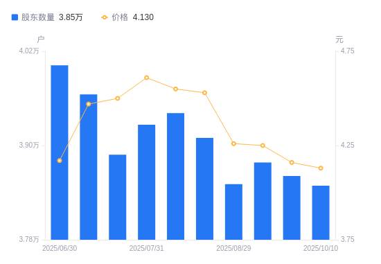 近一年(2024年10月10日至2025年10月10日),津药药业A股股东户数从4.21万户,减低至3.85万户,降幅8.55%,区间股价上涨1.18%。