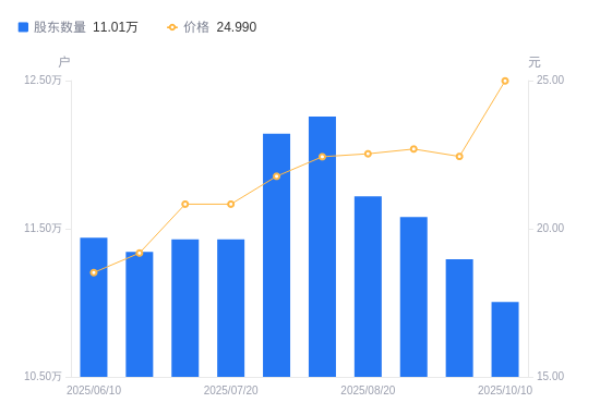 近一年(2024年10月10日至2025年10月10日),西藏矿业A股股东户数从12.82万户,减低至11.01万户,降幅14.16%,区间股价上涨7.67%。
