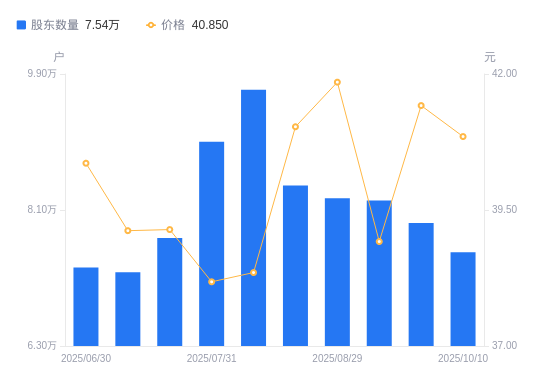 近一年(2024年10月10日至2025年10月10日),中航光电A股股东户数从6万户,增加至7.54万户,增幅25.80%,区间股价下跌3.66%。