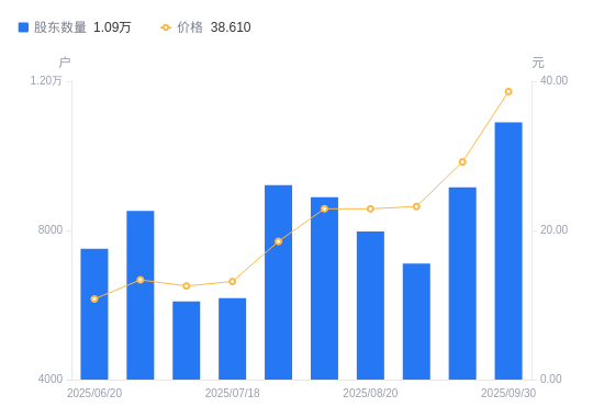 近一年(2024年9月30日至2025年9月30日),菲林格尔A股股东户数从8256户,增加至1.09万户,增幅32.01%,区间股价上涨1025.66%。