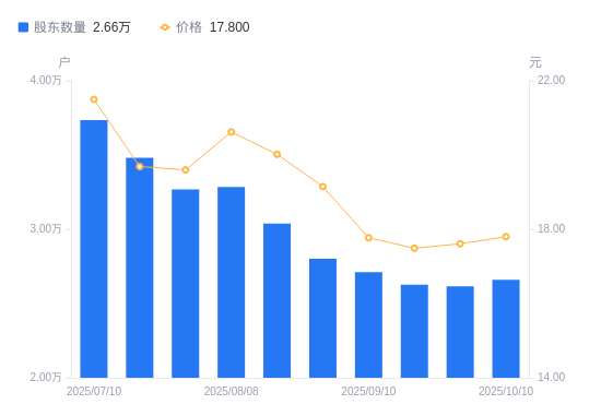 近一年(2024年10月10日至2025年10月10日),中船汉光A股股东户数从2.9万户,减低至2.66万户,降幅8.41%,区间股价上涨5.49%。