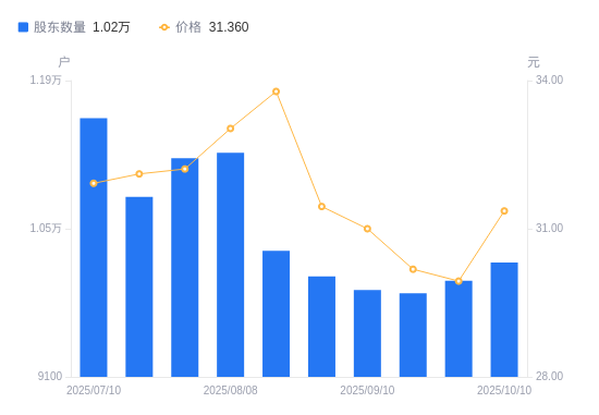 近一年(2024年10月10日至2025年10月10日),争光股份A股股东户数从1.14万户,减低至1.02万户,降幅10.85%,区间股价上涨30.01%。