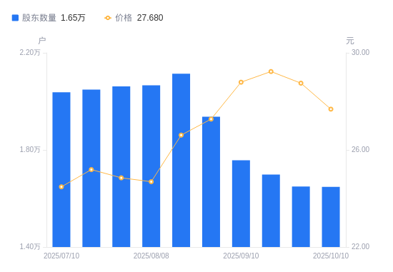 近一年(2024年10月10日至2025年10月10日),鸿合科技A股股东户数从1.63万户,增加至1.65万户,增幅1.15%,区间股价上涨18.99%。