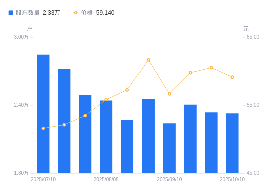 10月13日消息,数据显示,截至2025年10月10日,中瓷电子A股股东总户数为2.33万户,较上期(2025年9月30日)减少79户,降幅0.34%。公司最新A股总股本为4.51亿股,其中流通A股3.4亿股,户均持有流通A股数量为1.46万股,较上期增加49.38股,增幅0.34%;户均持流通A股市值86.38万元,较上期减少1.72万元,降幅1.95%。