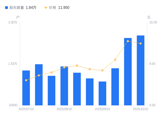 近一年(2024年12月31日至2025年10月10日),*ST亚太A股股东户数从1.88万户,减低至1.84万户,降幅2.12%,区间股价上涨241.43%。