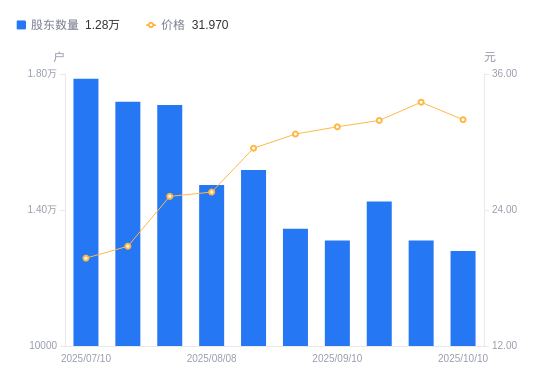 近一年(2024年10月10日至2025年10月10日),洁美科技A股股东户数从1.76万户,减低至1.28万户,降幅27.10%,区间股价上涨62.17%。