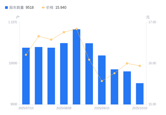 近一年(2024年10月31日至2025年10月10日),申科股份A股股东户数从2.25万户,减低至9518户,降幅57.66%,区间股价上涨23.85%。