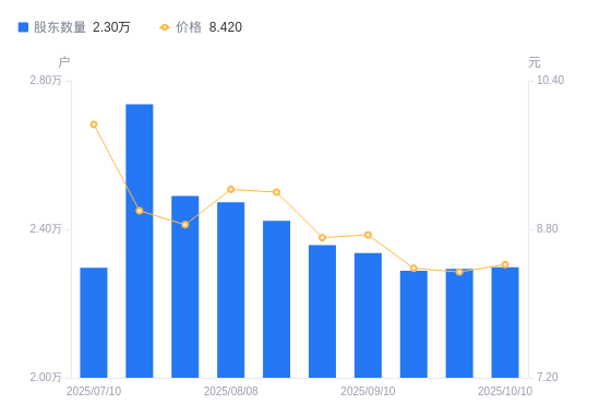 近一年(2024年10月10日至2025年10月10日),英力特A股股东户数从2.55万户,减低至2.3万户,降幅10.03%,区间股价上涨29.34%。