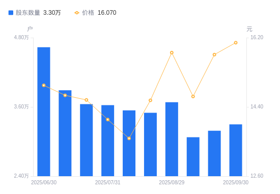 10月13日消息,数据显示,截至2025年9月30日,阳谷华泰A股股东总户数为3.3万户,较上期(2025年9月19日)增加1100户,增幅3.45%。公司最新A股总股本为4.49亿股,其中流通A股4.33亿股,户均持有流通A股数量为1.31万股,较上期减少452.96股,降幅3.33%;户均持流通A股市值21.11万元,较上期减少3067.08元,降幅1.43%。