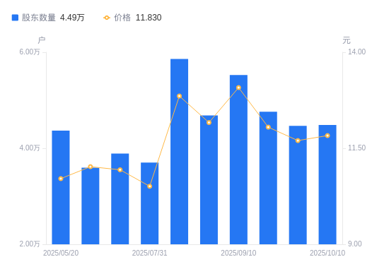 近一年(2024年10月10日至2025年10月10日),山东章鼓A股股东户数从3.4万户,增加至4.49万户,增幅32.08%,区间股价上涨47.69%。