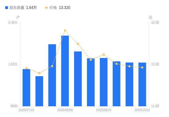 近一年(2024年10月10日至2025年10月10日),启迪设计A股股东户数从1.69万户,减低至1.64万户,降幅3.20%,区间股价上涨12.88%。