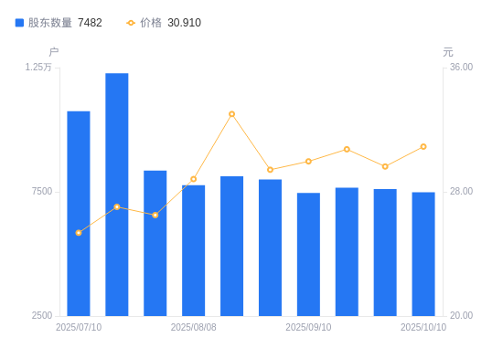 近一年(2024年12月31日至2025年10月10日),山科智能A股股东户数从8255户,减低至7482户,降幅9.36%,区间股价上涨69.72%。