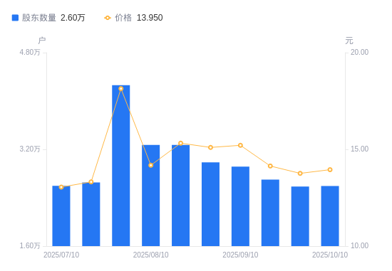 近一年(2024年10月10日至2025年10月10日),阳光乳业A股股东户数从2.15万户,增加至2.6万户,增幅20.87%,区间股价上涨30.99%。