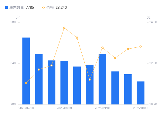 近一年(2024年10月18日至2025年10月10日),楚环科技A股股东户数从8561户,减低至7785户,降幅9.06%,区间股价上涨36.22%。
